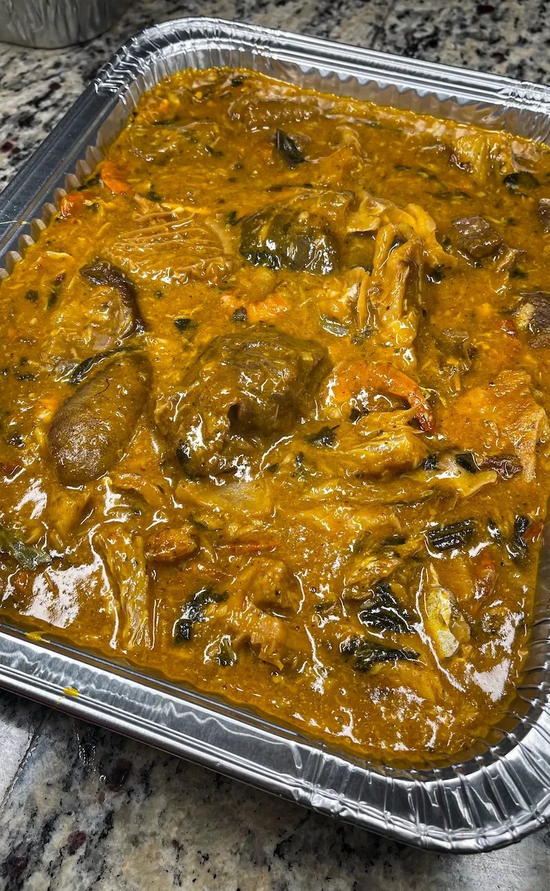 Draw soup made from ground wild‑mango seeds with assorted meats.